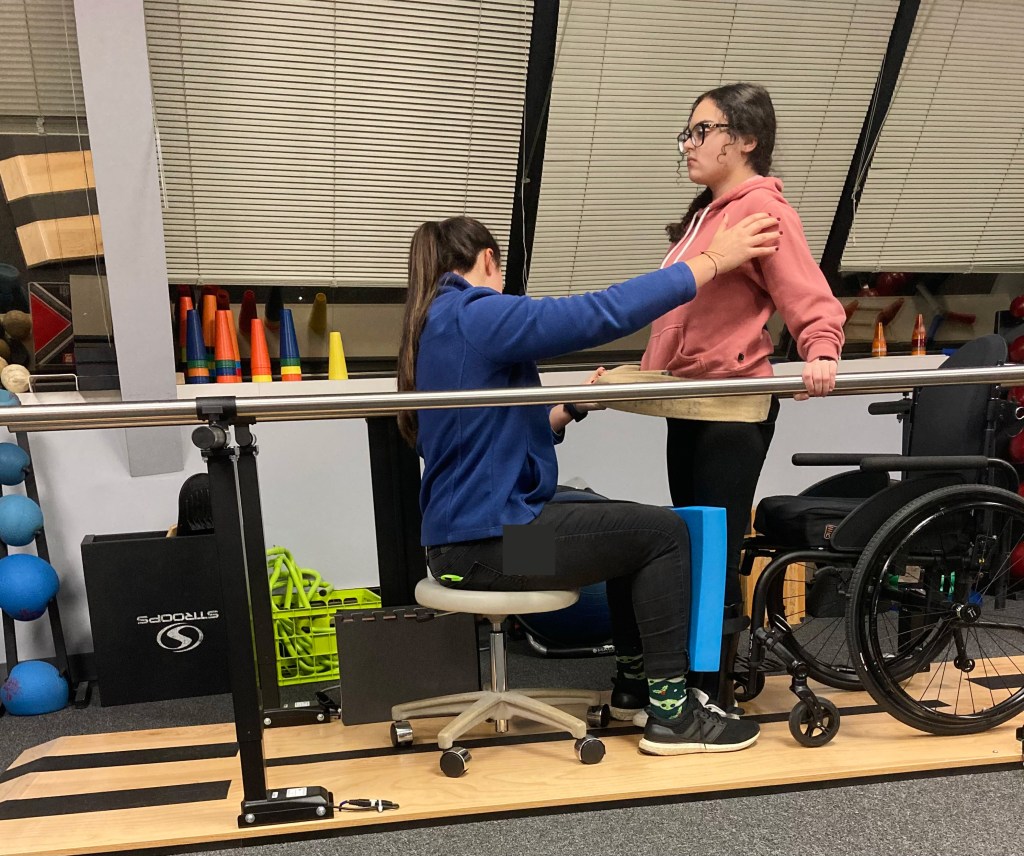 As at the beginning of my appointments, I wasn’t able to take even a few steps. I held onto parallel bars and PTs surrounded me in case I fell. I tried this again at a recent appointment, and I was so shocked at myself for having walked a foot or two.